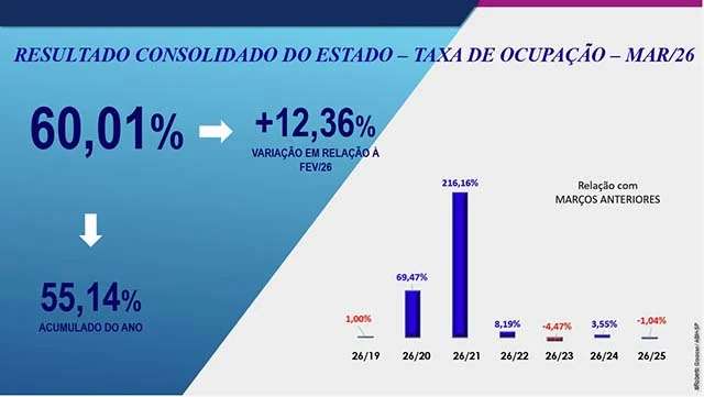 Os três principais indicadores da pesquisa registraram alta em comparação com fevereiro de 2026. A Taxa de Ocupação (TO) cresceu 12,36%, a Diária Média (DM) aumentou 0,99% e o RevPar (Receita por Quarto Disponível) teve um expressivo aumento de 13,47%. O RevPar, em particular, alcançou o segundo maior índice histórico registrado pela série, demonstrando a força da recuperação.
