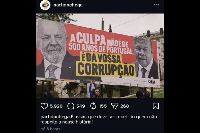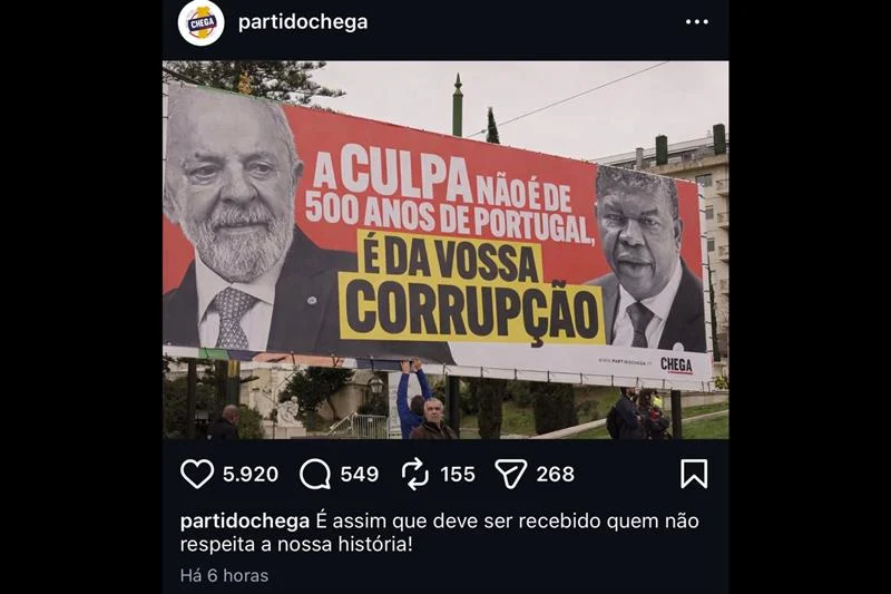 O partido de direita português Chega, liderado pelo deputado André Ventura, exibiu um cartaz com críticas ao presidente Luiz Inácio Lula da Silva (PT) e ao presidente de Angola, João Lourenço, em frente à Assembleia da República, em Lisboa. O ato ocorreu nesta segunda-feira (9), dia da posse do socialista António José Seguro como novo presidente português.